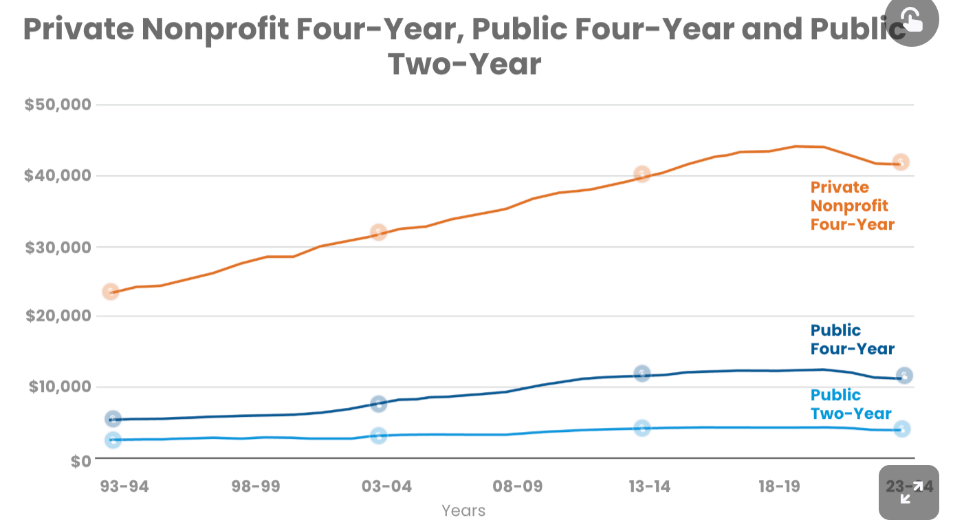 In its 2023 report, the College Board showed that in-state tuition and fees at private non-profit four-year institutions increased by 5% in inflation-adjusted dollars between the 2013-14 and 2023-24 school years.1