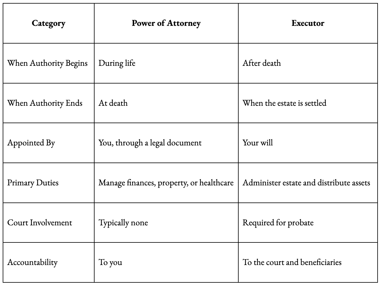 What is the difference between a power of attorney and an executor?