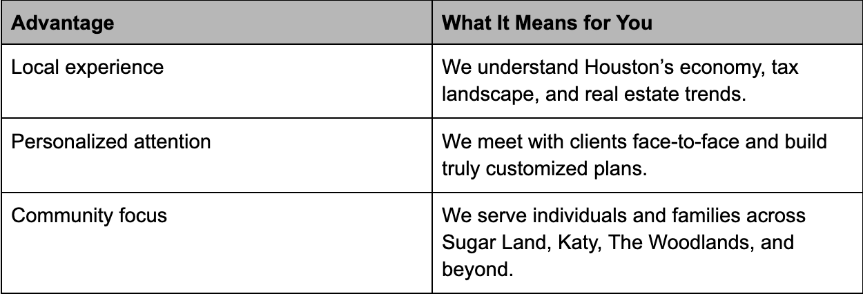 - International Trade & Logistics: Business owners and executives tied to the Port of Houston often need integrated wealth, tax, and succession planning.
